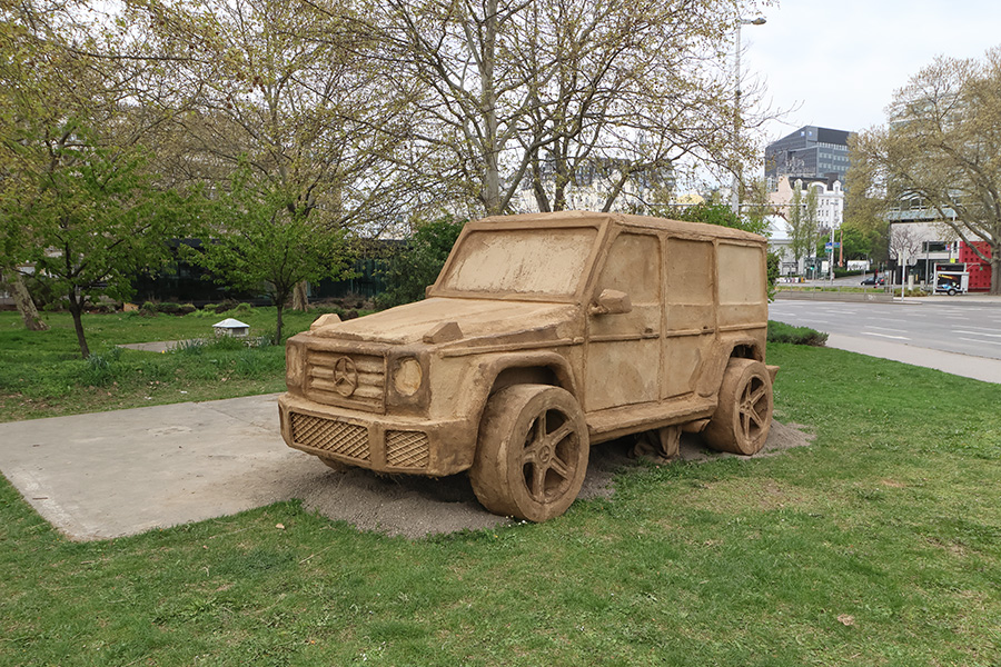 Das Kunstwerk „Maaaaash!“ (2026) von Folke Köbberling ist eine ungewöhnliche Skulptur im öffentlichen Raum Wiens, die auf den ersten Blick wie ein luxuriöses SUV erscheint. Tatsächlich handelt es sich um eine detailgetreue 1:1-Nachbildung eines Geländewagens – jedoch nicht aus Metall, sondern aus einem speziell entwickelten, biologisch abbaubaren Verbundmaterial. Die Skulptur ist bewusst den Witterungseinflüssen ausgesetzt und beginnt im Laufe der Zeit zu zerfallen. Während echte Autos den Stadtraum oft dauerhaft dominieren, verwandelt sich dieses Objekt langsam in etwas völlig anderes: Es bietet Lebensraum für Pflanzen und Mikroorganismen und wird Teil eines natürlichen Kreislaufs.