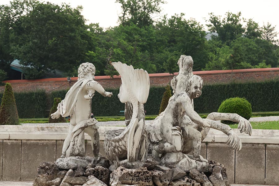 Kleiner Brunnen im oberen Parterre des Gartens von Schloss Belvedere in Wien. Der barocke Brunnen aus dem 1. Viertel des 18. Jahrhunderts zeigt zwei Putti auf einem Felssockel, in der Mitte ein Hippokamp.