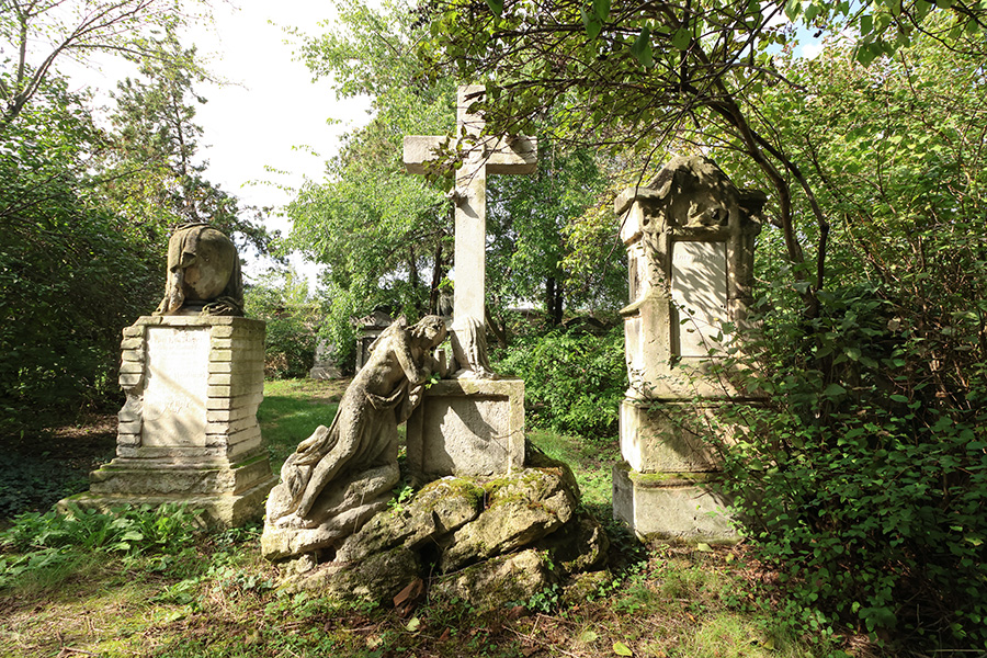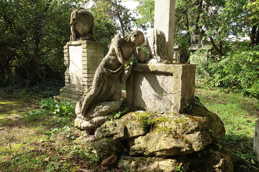 Der Biedermeierfriedhof St. Marx in Wien ist berühmt für seine stimmungsvollen Gräber, die romantische Kunst und christliche Symbolik miteinander verbinden. Ein besonders eindrucksvolles Grabmal zeigt ein hohes Steinkreuz auf felsigem Sockel, an dessen Fuß ein kniender Engel dargestellt ist. Der Engel stützt sich trauernd an das Postament und wendet den Blick nach unten – ein Sinnbild für die Trauer um den Verstorbenen und zugleich für die Verbindung zwischen Himmel und Erde.